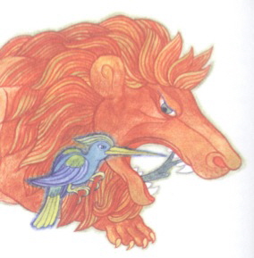 “Habe ich einen Hunger!”, brüllte der Löwe und sein markerschütterndes Löwengebrüll ließ den Urwald erzittern. Kurze Zeit später hatte er einen Wasserbüffel getötet und war gerade dabei, ihn voller Heißhunger zu verschlingen. Der Vogel, der das alles beobachtete, dachte: “Ich will ihn auf die Probe stellen.”