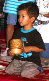 Natürlich ist es das Beste, wenn ihr euren Kindern ein gutes Beispiel seid. Kinder imitieren! Das heißt, scheut euch nicht, euren Kindern zu zeigen, dass ihr (regelmäßig) meditiert. Wenn ihr Platz genug in eurer Wohnung habt, richtet einen „Familienaltar“ ein. Das kann ein Regal sein, auf dem eine Buddhastatue steht, ein Thangka an der Wand oder auch ein Tischchen, auf dem Opferschälchen stehen und einige Buddhastatuen. Wenn ihr diese Stelle als eure Familienmeditationsstelle einrichtet, dann versucht, dort auch mehr oder weniger regelmäßig zu meditieren. Das muss nicht lange sein. Fünf Minuten oder zehn Minuten reichen aus. Das Wichtige ist, ihr versucht es zu einer festen Einrichtung zu machen. Kinder lieben bekanntlich Rituale.