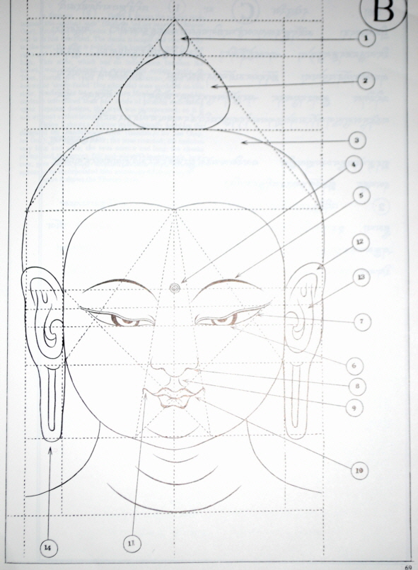 Auch im Gesicht des Buddha ist alles genau festgelegt. In welchem Abstand sich die Ohren von einander befinden, wie groß der Mund ist, wie die Augenbrauen geschwungen sind. Ihr könnt die Maßverhältnisse auf der Zeichnung gegenüber sehen.
