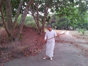 Von 9 Uhr morgens bis 2 Uhr Nachmittags ist Zeit für die tägliche Praxis, vor allem Sitz- und Gehmeditation. Von 2 bis 3 Uhr haben wir freie Zeit, das trinke ich Tee oder Fruchtsaft und relaxe. Danach fege ich und räume auf, wasche meine Kleider und tue, was ansteht. Von 5 bis 6 Uhr ist Zeit zu duschen. Von 6 bis 7 Uhr ist Zeit für da s tägliche Chanten, und von 7 Uhr abends bis 11 Uhr nachts meditiere ich.